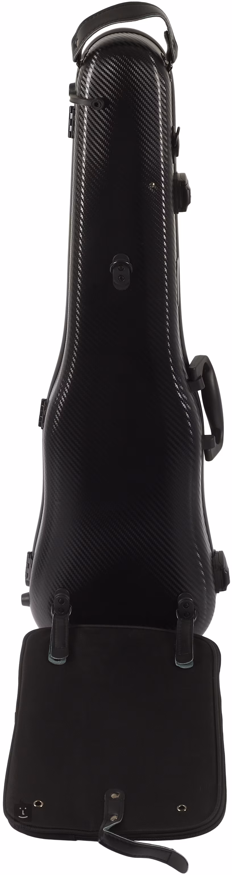 Geigenkoffer aus Kohlefaserverbundstoff mit zwei Schlössern und Code/Passwort-Entriegelung, abnehmbarem Notenfach, Griffen an den Seiten und oben, zwei Schulterriemen und zwei Bogenhaltern.