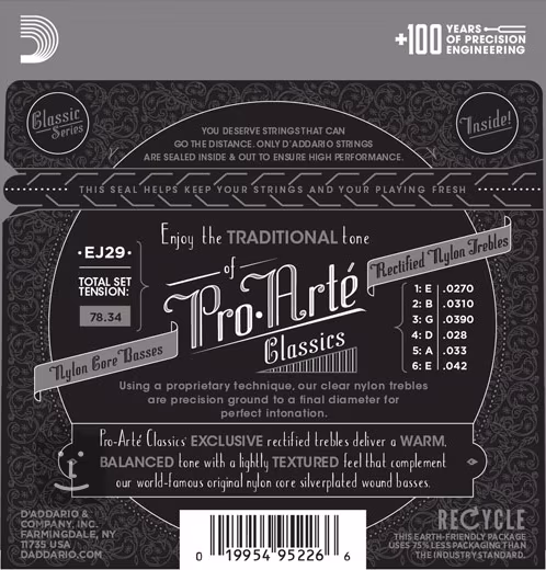 Pro-Arté Rectified Nylon Saiten sind bekannt für ihren warmen, runden Ton und ihre fein strukturierte Oberfläche. Die hohen Nylonsaiten werden mit einer speziellen Technik geschliffen, die ihnen Wärme, präzise Intonation und perfekte Kontrolle über die Dynamik verleiht. Zusammen mit den mit versilbertem Kupfer ummantelten Basssaiten ergibt sich ein perfekt runder Klang, der durch seine Subtilität besticht. Die Lower Tension (Moderate Tension), der weichste Satz der Serie, zeichnet sich durch eine angenehme Weichheit und einen außergewöhnlich sanften Ton aus.