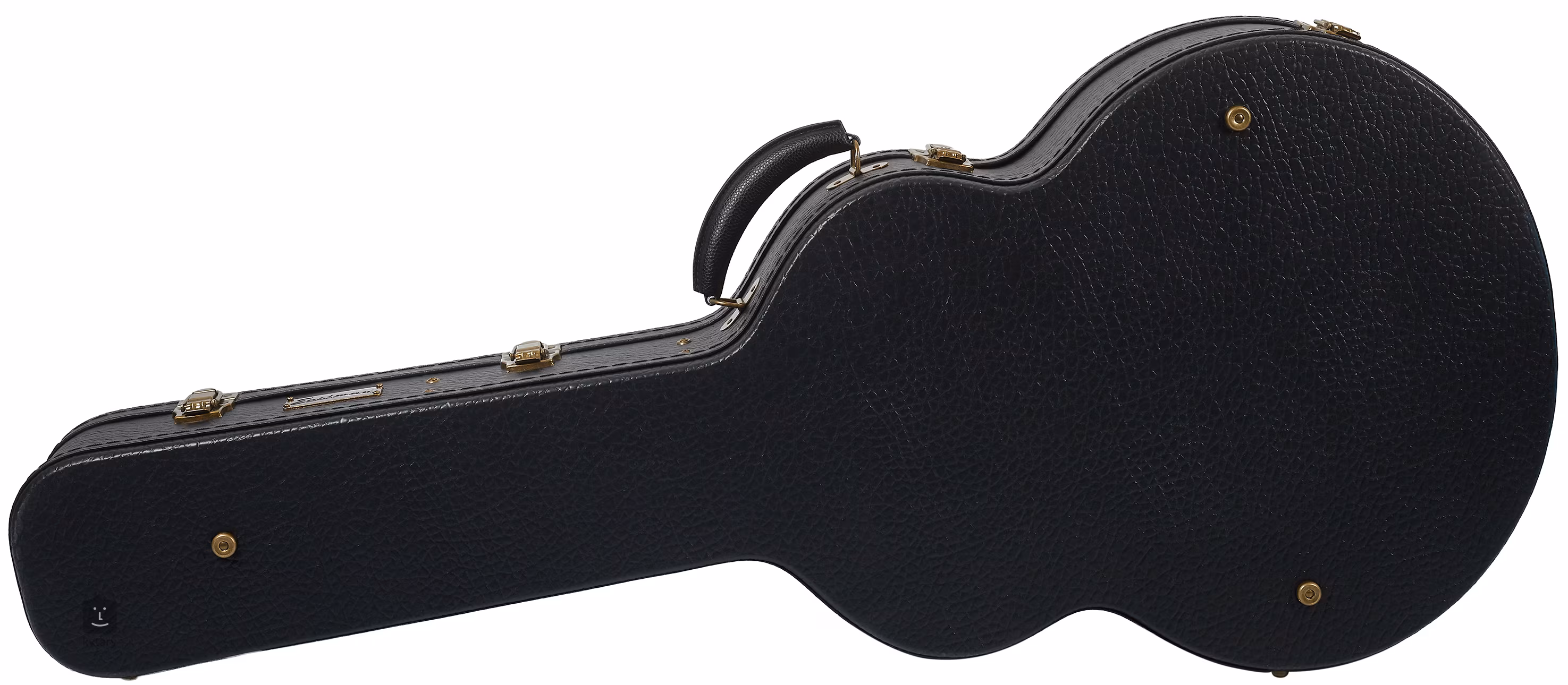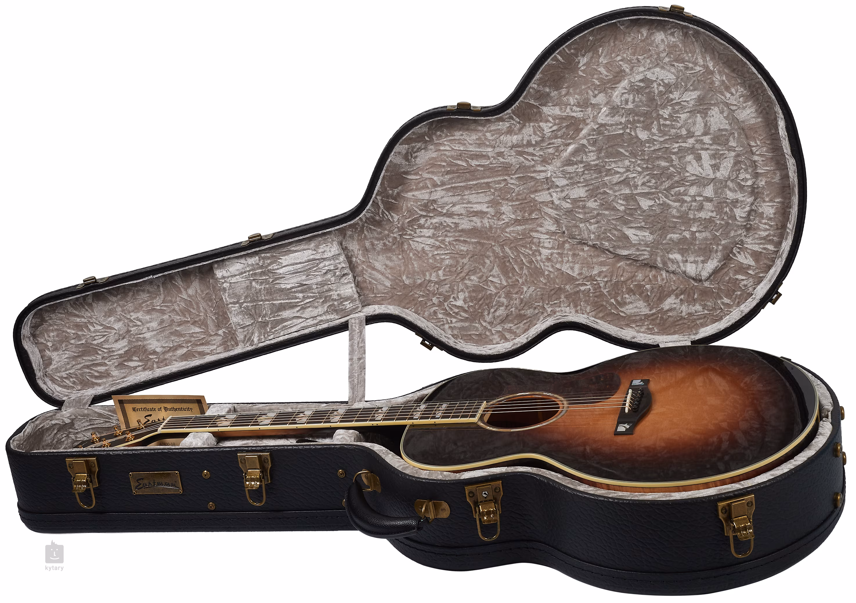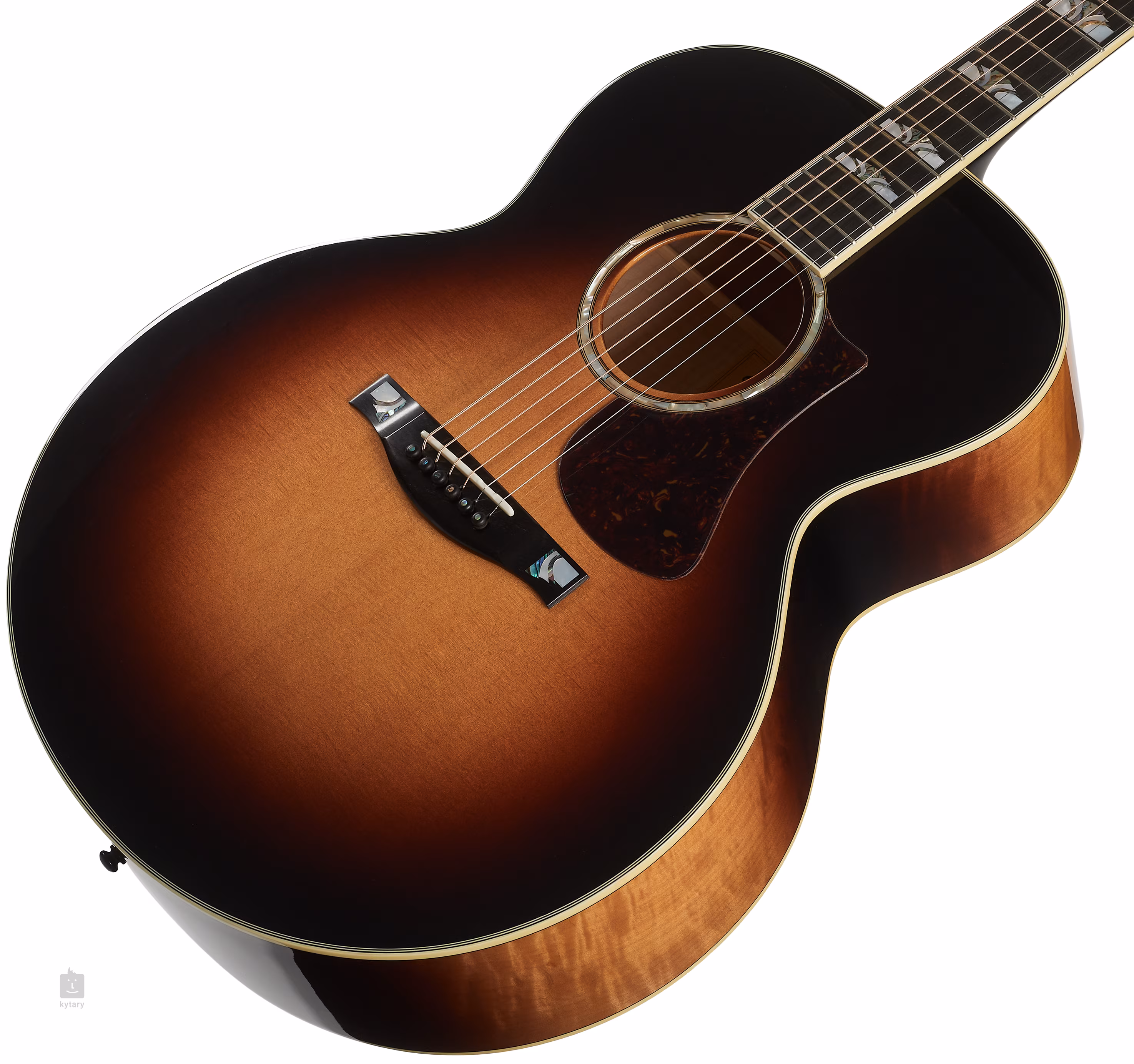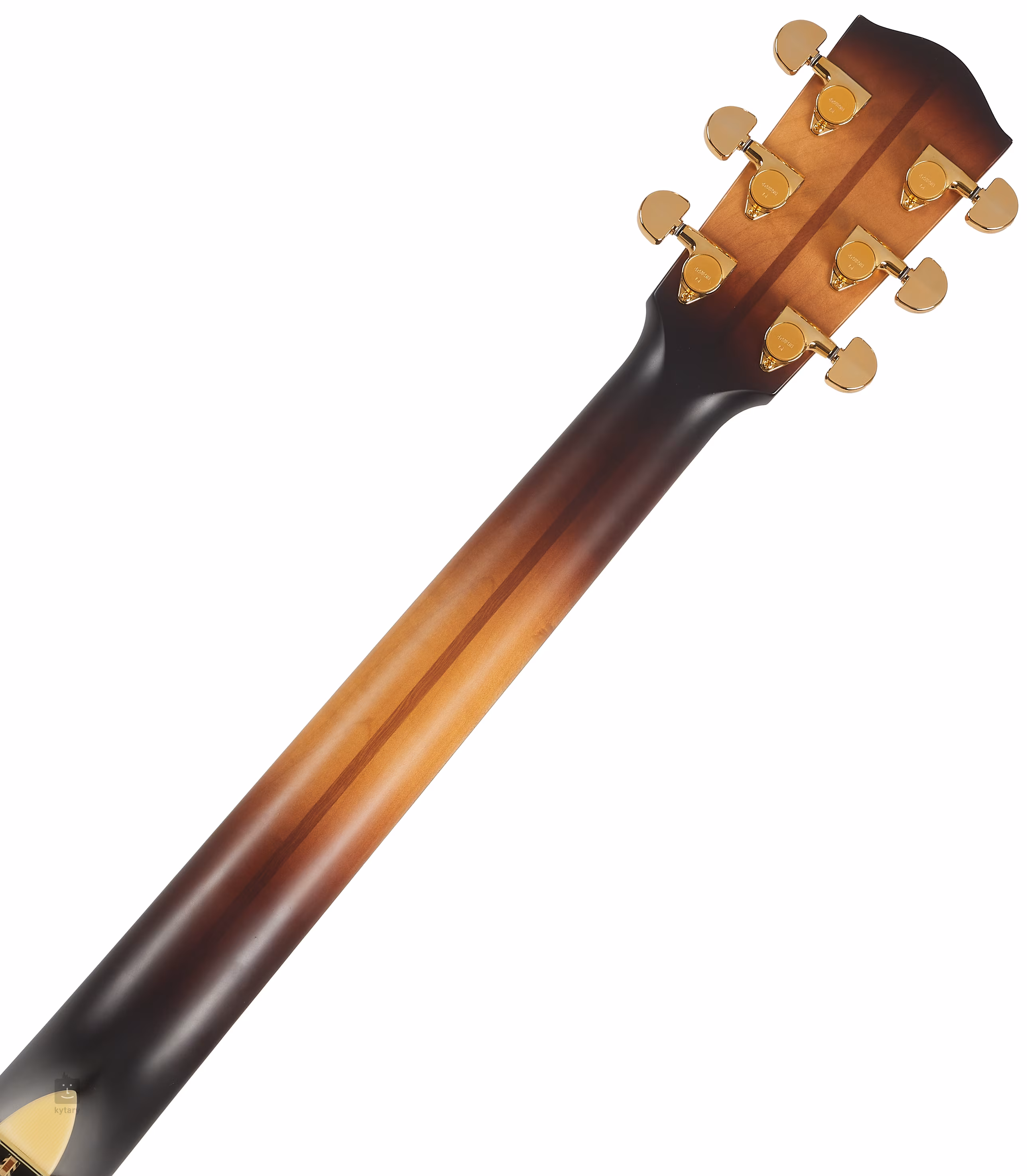 Die Saiten sind über dem Knochen-Nullbund in Gotoh SG301-20GG-Mechaniken in Gold-Finish und einem Ebenholz-Griffbrett montiert. Die luxuriöse Verarbeitung wird durch die Randeinfassung des Korpus, des Griffbretts und der Kopfplatte aus gemasertem Ahorn, die Perlmutt-Rosette (Abalone), den Mittelstreifen auf der Bodenplatte, das Schlagbrett aus Schildpatt-Imitat und das Perlmutt-Motiv und Firmenlogo auf der Kopfplatte unterstrichen.
