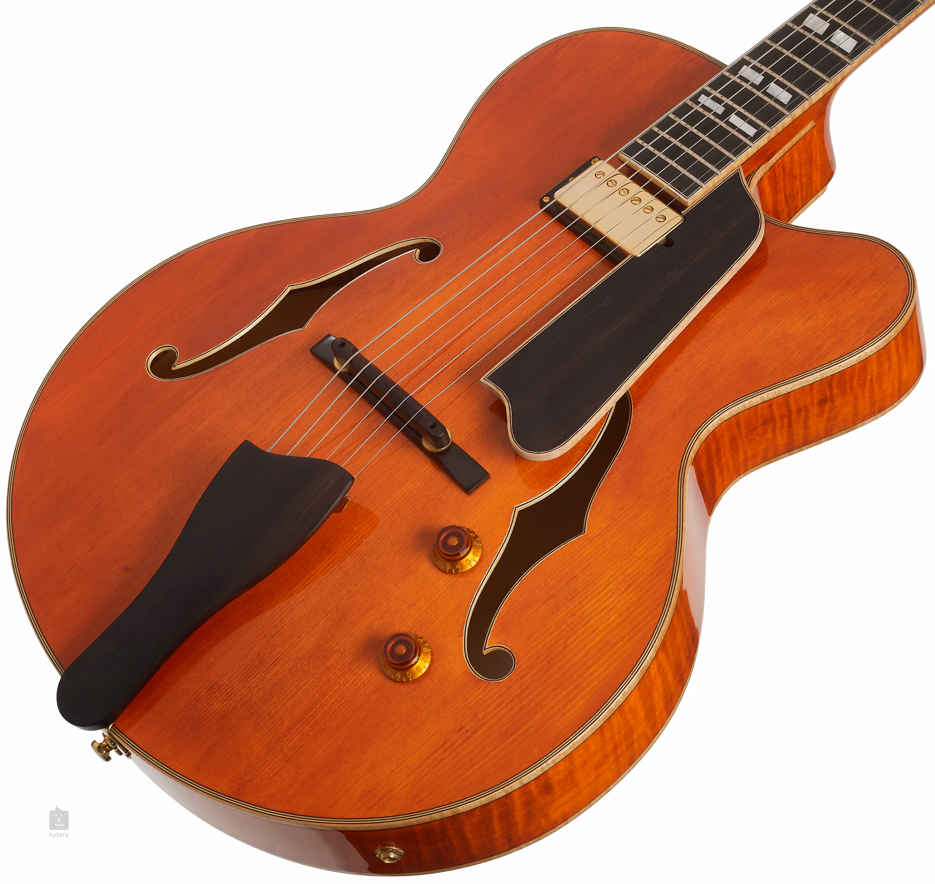 Der Seymour Duncan Jazz-Halstonabnehmer mit Alnico 5-Magnet verleiht der Gitarre einen klaren, warmen und dynamischen Sound, den nicht nur Jazz-Gitarristen zu schätzen wissen werden. Mit den Standardreglern lässt sich der Klangcharakter einstellen. Die Saiten sind in den Stimmmechaniken der renommierten Marke Gotoh und über ein verstellbares Ebenholz-Griffbrett in den Stringern (Ebenholz/Messing) montiert. Die feine Verarbeitung wird durch den glänzend lackierten Korpus (Truetone Gloss), den doppelseitigen Ahornkorpus, das Griffbrett und die Kopfplatte, das Ebenholz-Schlagbrett mit Ahorn-Zierleiste, die goldene Hardware und das Perlmutt-Firmenlogo auf der Kopfplatte unterstrichen.