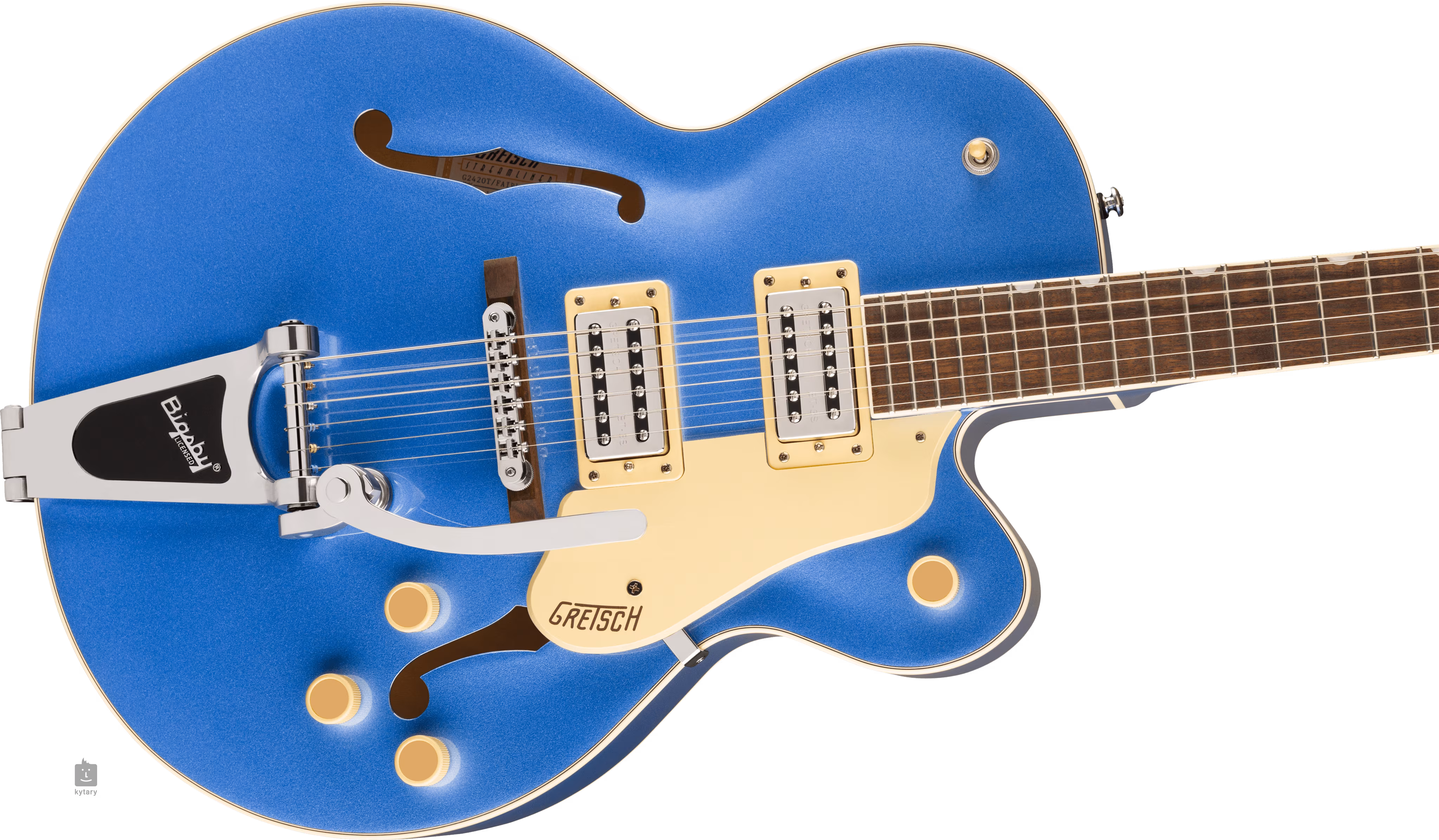Der Korpus der G2420T Streamliner Hollow Body Single-Cut Fairlane Blue ist aus laminiertem Ahorn gefertigt. Der Nato-Hals mit "Soft C"-Profil ist auf ein Feigengriffbrett mit zweiundzwanzig Medium-Jumbo-Bünden geleimt. Die Orientierung auf seiner Oberfläche wird durch versetzte Positionsmarker aus Perlmuttimitat (Pearloid Neo-Classic Thumbnail) erleichtert.