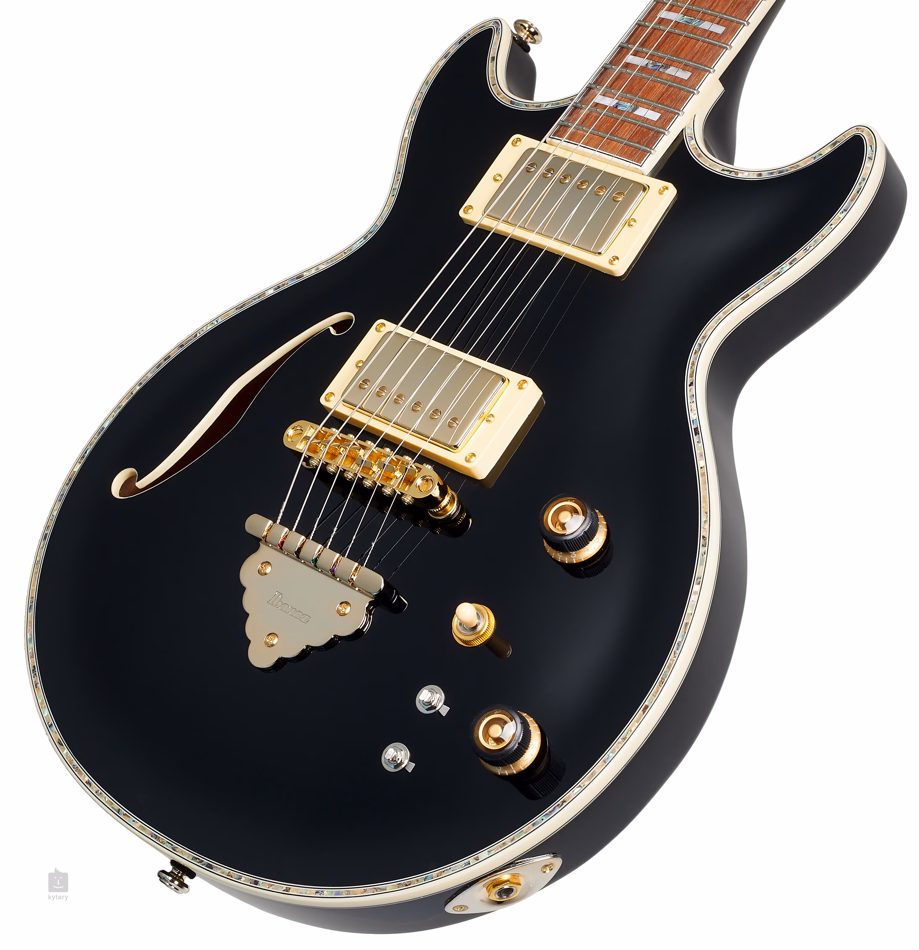Die Ibanez AR520H-BK ist eine Double-Cut E-Gitarre mit einem Semi-Hollowbody-Design. Der Korpus des Instruments besteht aus einer Ahorndecke, einem Okoumé-Boden und einem gekammerten Ahornkorpus. Der dreiteilige Ahornhals ist auf ein Jatoba-Griffbrett mit zweiundzwanzig mittelgroßen Bünden geklebt. Positionsblöcke aus Perlmutt- und Abalone-Imitat erleichtern die Orientierung auf der Griffbrettoberfläche.