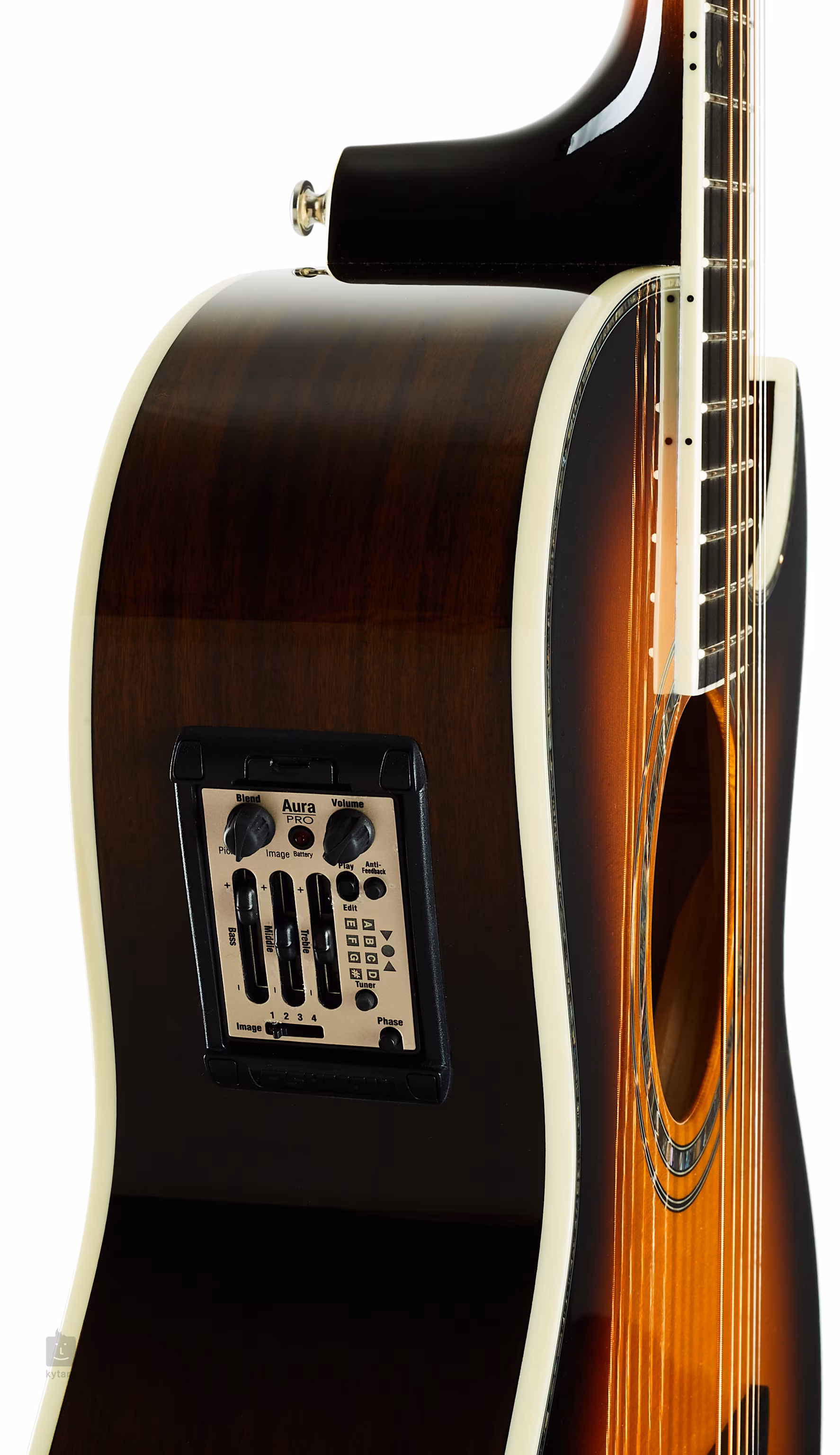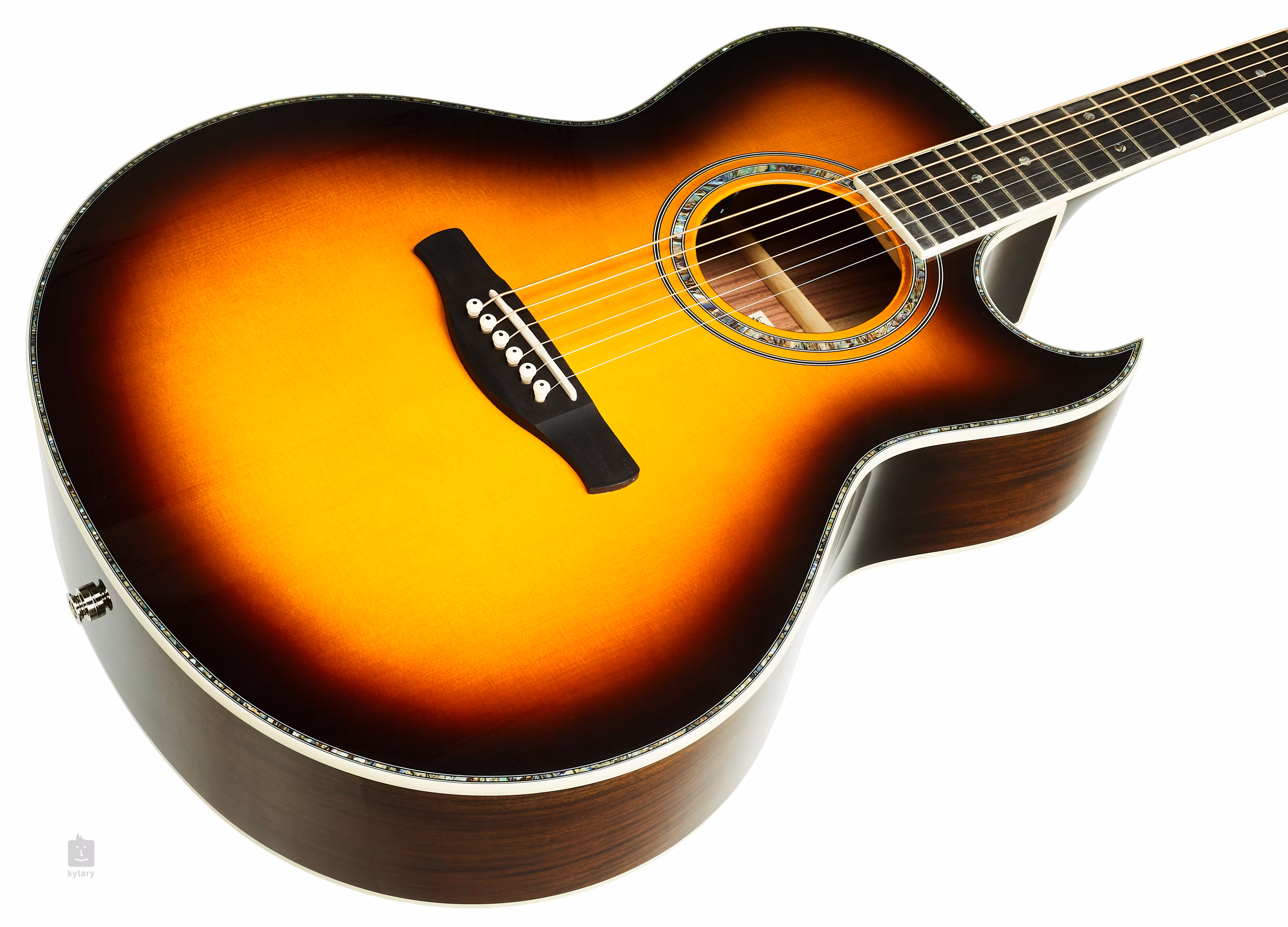 Der Korpus dieser Gitarre besteht aus massiven Materialien - Engelmann Fichte und Pau Ferro Holz Boden und Zargen. Auf den Hals aus exotischem Nyatoh-Holz ist ein Ebenholz-Griffbrett mit 20 Bünden geklebt. Die Resonanz des massiven Resonanzbodens wird durch die traditionelle X-Verzahnung unterstützt, während das Aussehen des Korpus durch eine glänzende Vintage-Burst-Lackierung, eine verzierte Perlmutt-Rosette, ein Perlmutt-Schlagbrett und ein Elfenbeinimitat-Binding verschönert wird. Die Orientierung auf dem Griffbrett wird durch Positionsmarkierungen, ebenfalls aus Perlmutt, erleichtert.