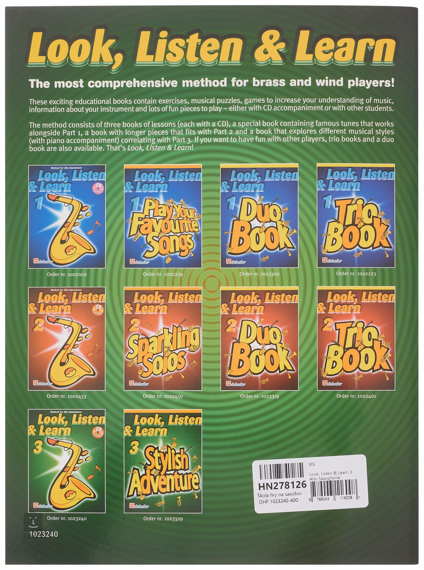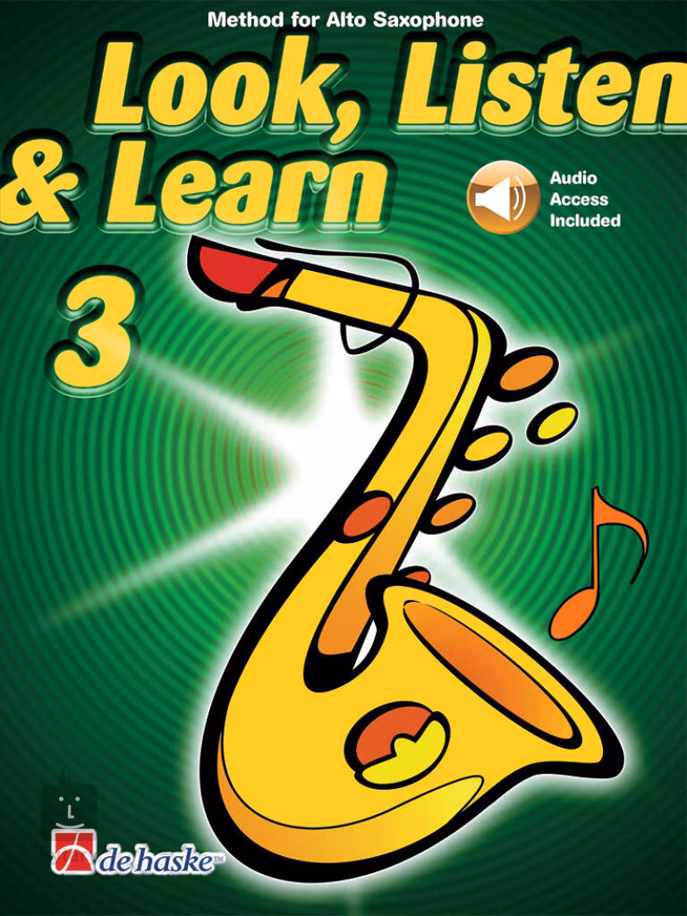 Der dritte Band der Altsaxophonschule Look, Listen & Learn 3 - Altsaxophon bietet Lieder mit Audio-CD-Begleitung, musikalische Rätsel und Spiele, um das Verständnis der Schüler für die Musik und das Instrument selbst zu verbessern. Die Lieder und Texte werden von nützlichen Informationen in Diagrammen und lustigen Illustrationen begleitet.