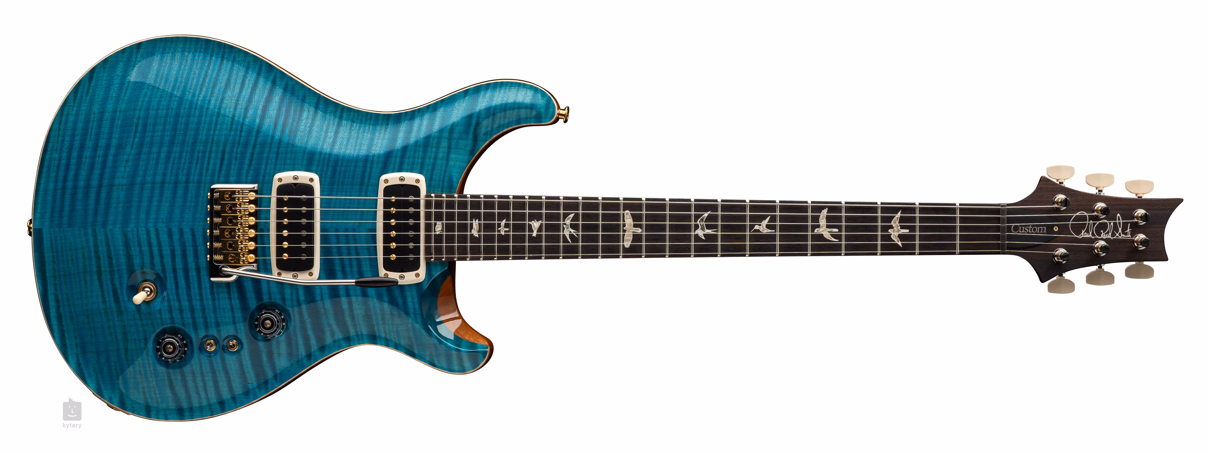 Das Modell Custom 24-08 Carroll Blue besticht auf den ersten Blick durch die Kombination aus einem ergonomisch geformten Mahagonikorpus mit dem typischen PRS-Double-Cutaway und einer gemaserten Ahorndecke mit cooler Holzmaserung. Ein einteiliger Mahagoni-Hals mit Pattern Thin-Profil ist mit einem Palisander-Griffbrett mit vierundzwanzig Bünden verleimt. Die Orientierung auf dem Griffbrett wird durch die PRS-typischen Positionsmarkierungen in Form von perlmuttfarbenen Vogelsilhouetten erleichtert.