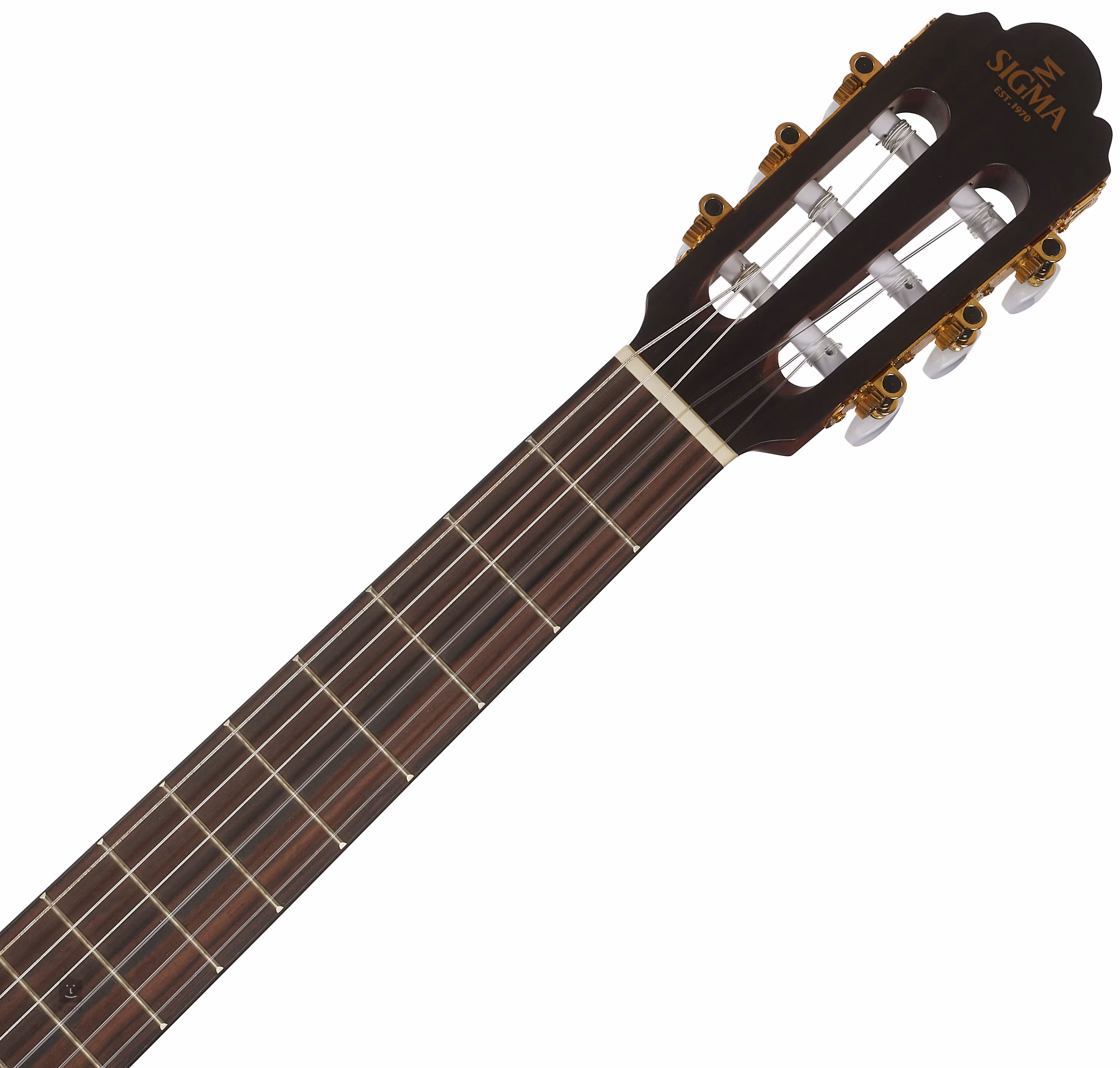 Sigma CTMC-2E ist eine modernere klassische elektroakustische Gitarre, die für Anfänger und erfahrene Musiker geeignet ist. Sie hat einen schmaleren, halbmassiven Korpus (80 mm tief), der aus einer massiven Zedernfront und einem Mahagoni-Boden und -Zargen besteht. Auf den schmaleren Mahagoni-Hals ist ein Palisander-Griffbrett mit neunzehn Bünden geklebt (die Breite des Nullbundes entspricht 47,63 mm).