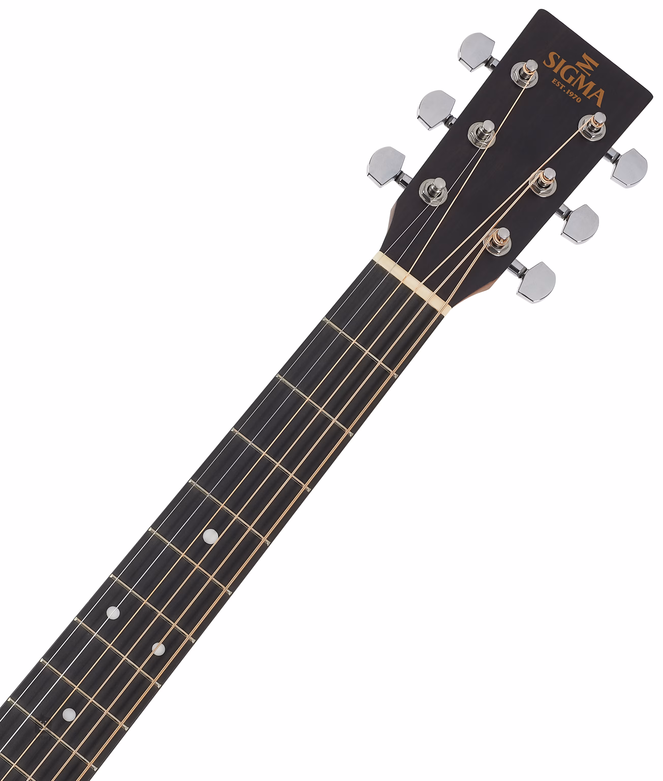 Die Vorderseite der Gitarre ist aus massiver Sitka-Fichte gefertigt, Boden und Zargen sind aus laminiertem Mahagoni. Der Korpus ist mit einer dünnen Schicht Satin-Lack überzogen. Mit ihrer bewährten Kombination aus Fichte und Mahagoni und dem ausgewogenen Verhältnis von klanglicher Klarheit und Wärme ist die Sigma DM-ST eine universell gute Wahl für viele Musikstile.