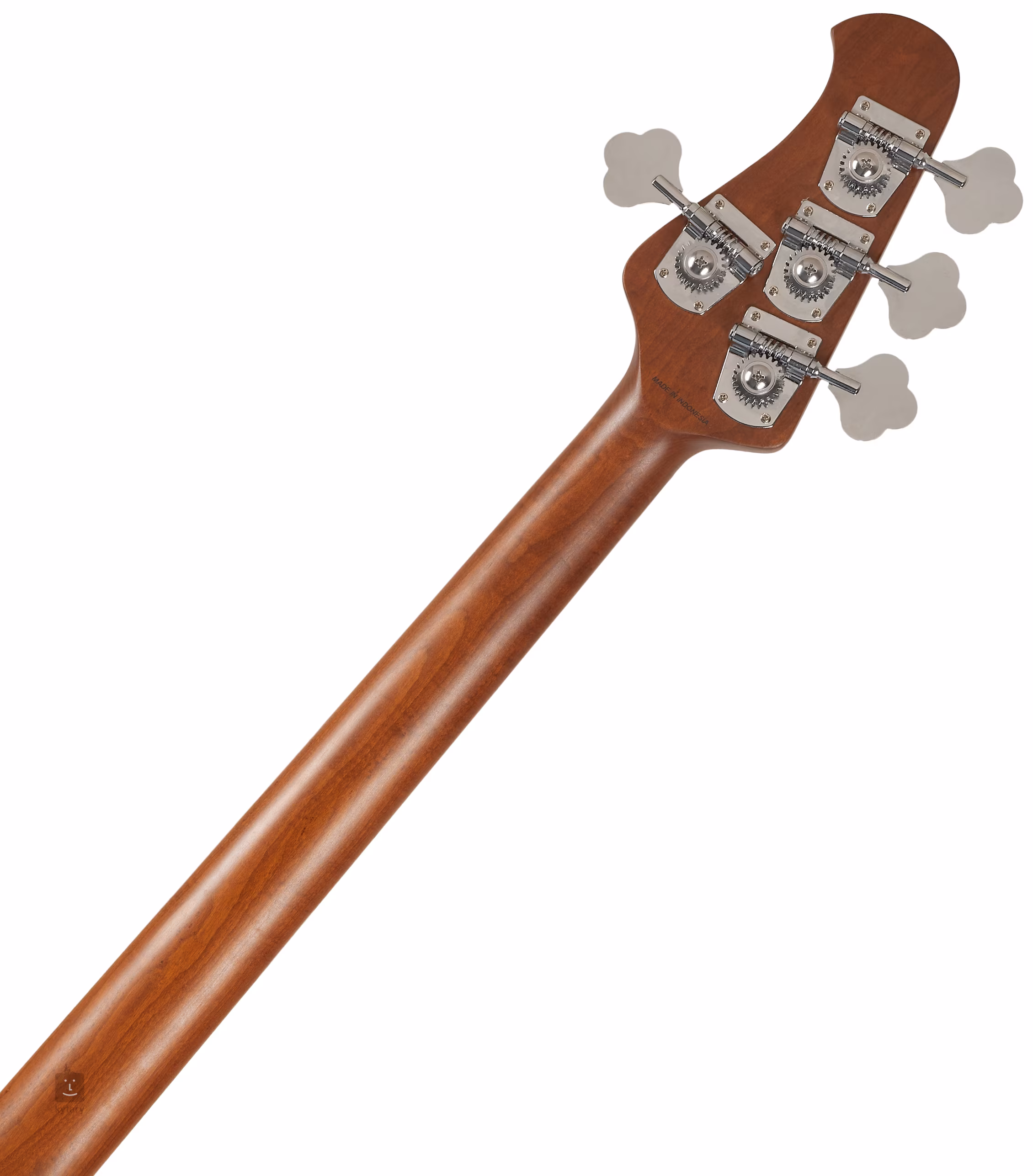 Auf der anderen Seite sind die Saiten in einer verchromten Vintage Music Man Designed Kopfplatte aus gehärtetem Stahl verankert. Natürlich verfügt die Gitarre über eine verstellbare Halsstütze, die ohne das Entfernen der Saiten oder anderer Hardware bearbeitet werden kann.